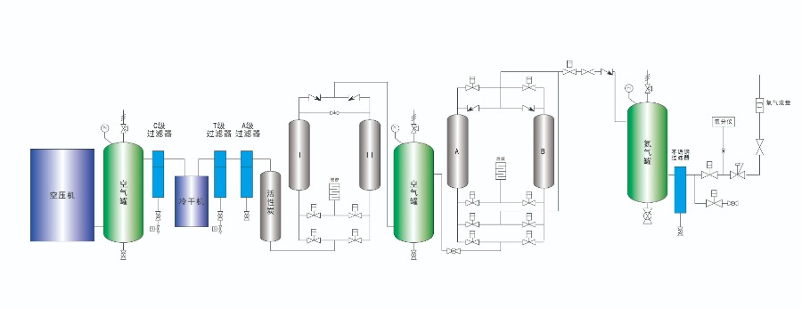 Sử dụng khí nén sạch làm nguyên liệu thô và sàng phân tử carbon làm chất hấp phụ, theo sự khác biệt về lượng hấp phụ oxy và nitơ trong không khí trên bề mặt sàng phân tử carbon và tốc độ khuếch tán khác nhau của oxy và nitơ trong sàng phân tử carbon, bộ điều khiển lập trình được sử dụng để điều khiển việc mở và đóng van điều khiển chương trình để thực hiện quá trình hấp phụ và giải nén có áp suất giải hấp, hoàn thành việc tách oxy và nitơ và đạt được độ tinh khiết cần thiết của nitơ.